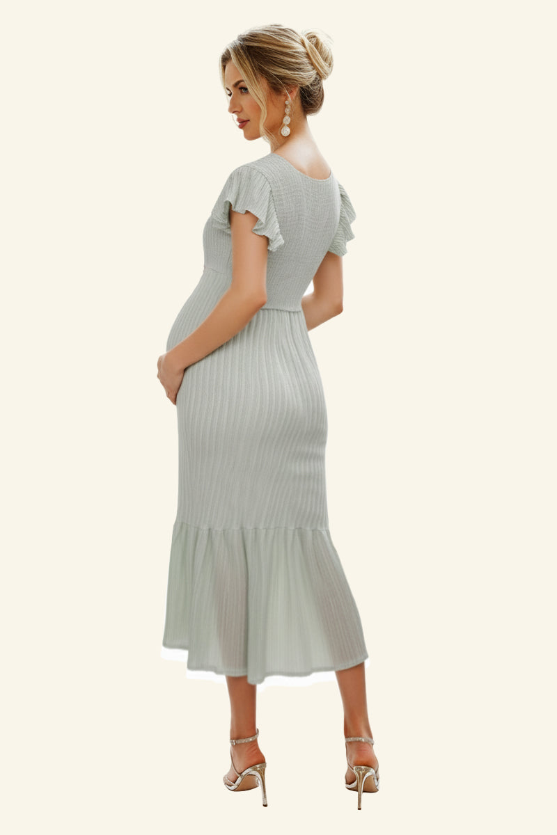 Designed for everyday ease, this maternity dress blends relaxed comfort with a touch of feminine charm. The flattering V-neckline and soft ruffle cap sleeves create an effortless look you can wear from morning errands to casual outings. Featuring a bump-friendly empire waist and a lightweight ribbed texture, this dress moves with you comfortably throughout pregnancy while keeping your style simple, polished, and relaxed.