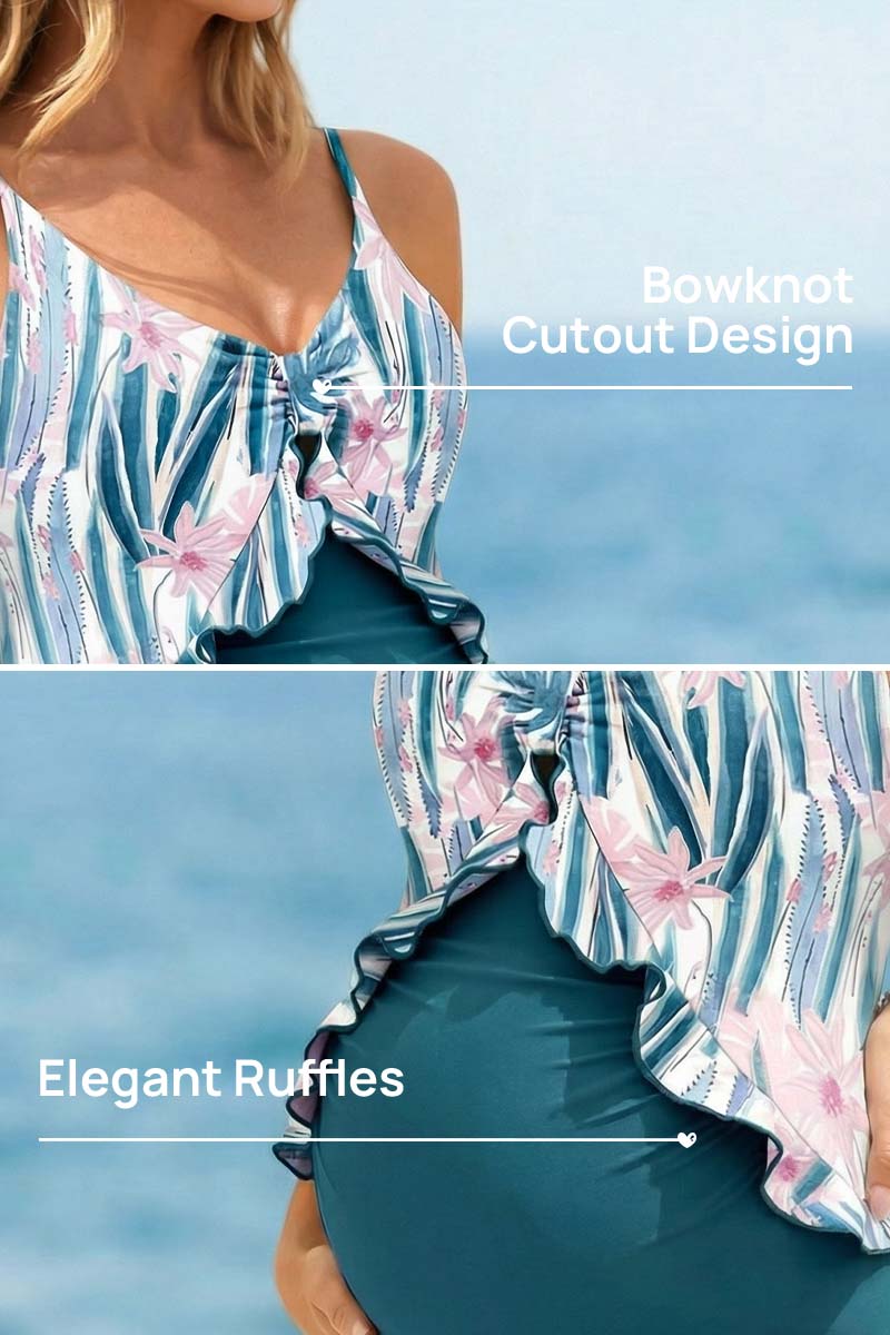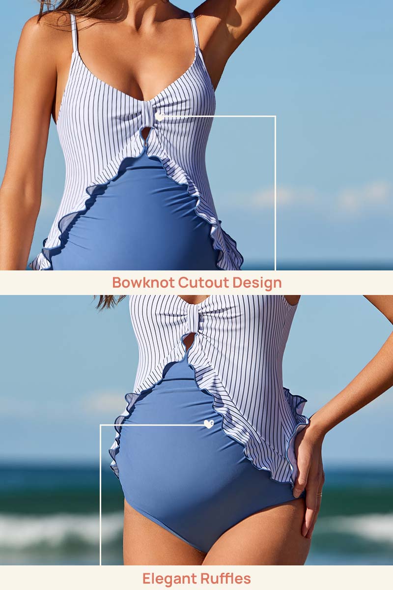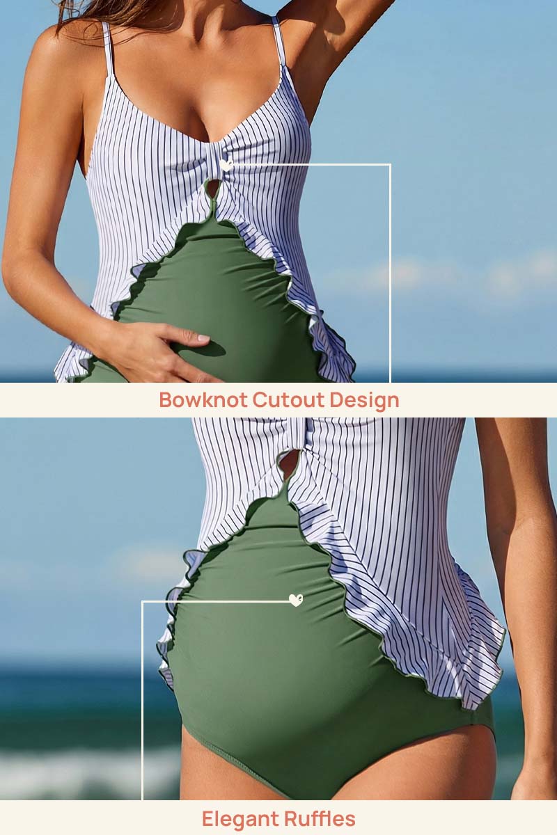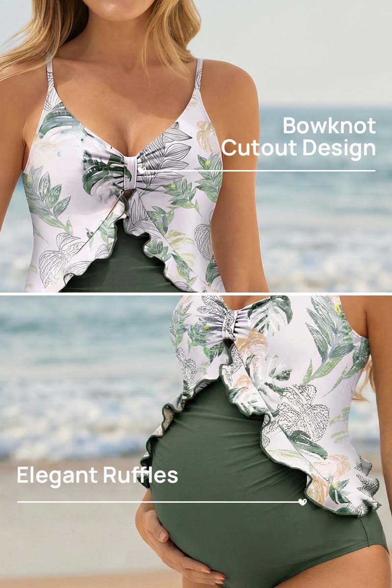 Our adjustable straps ruffle maternity swimsuit boasts attractive chest and back cutouts, and continuous ruffles around both front and back add a touch of elegance and delicacy to your look. With adjustable straps and a customizable back, this swimsuit caters to diverse chest shapes and sizes, ensuring a comfortable and snug fit for different body types. The 3D butterfly bow embellishment at the chest and lower chest lace create a unique style for expecting mothers.