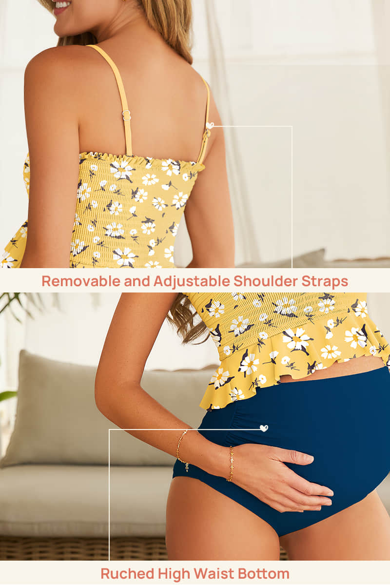 The ultimate hybrid fashion and functionality, this high waisted maternity bikini two piece is a holiday essential for mamas-to-be. Customize the high waisted bikini bottoms to show off your growing bump, or keep things covered up with ruched sides and a soft, supple stretch. This two piece bikini features a versatile top with flounce detailing, making it ideal for pairing with a sarong or maternity beach shorts. A true maternity style statement!