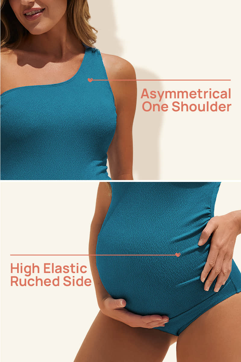 This solid maternity swimwear features a one-shoulder design with an o-ring link that brings visual balance. Removable push-up padded bras for added shape and support. High-cut design and ruched sides with tummy control will accommodate your changing curves through pregnancy.