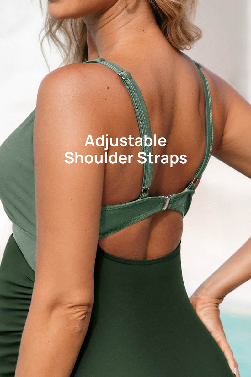 This cutout one-piece pregnancy swimwear features a plunge v-neck design, a twist criss-cross in the front, and removable padded bras that can provide excellent support for the chest and still look stylish. High elastic ruched sides and high-waisted pregnancy swimwear stretch enough to flatter your growing belly.