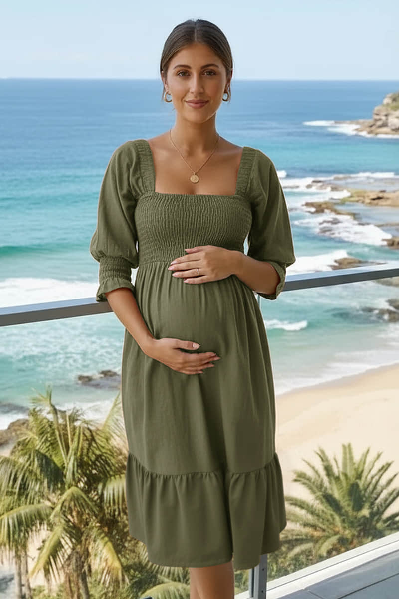Perfect for relaxed babymoon days and stylish getaway moments, this maternity dress blends effortless comfort with a chic, feminine design. The smocked bodice and puffed sleeves create a flattering silhouette, while the square neckline adds a touch of sophistication. Lightweight and flowy, this dress is ideal for strolling along the beach, enjoying resort dinners, or capturing memorable pregnancy moments during your babymoon.