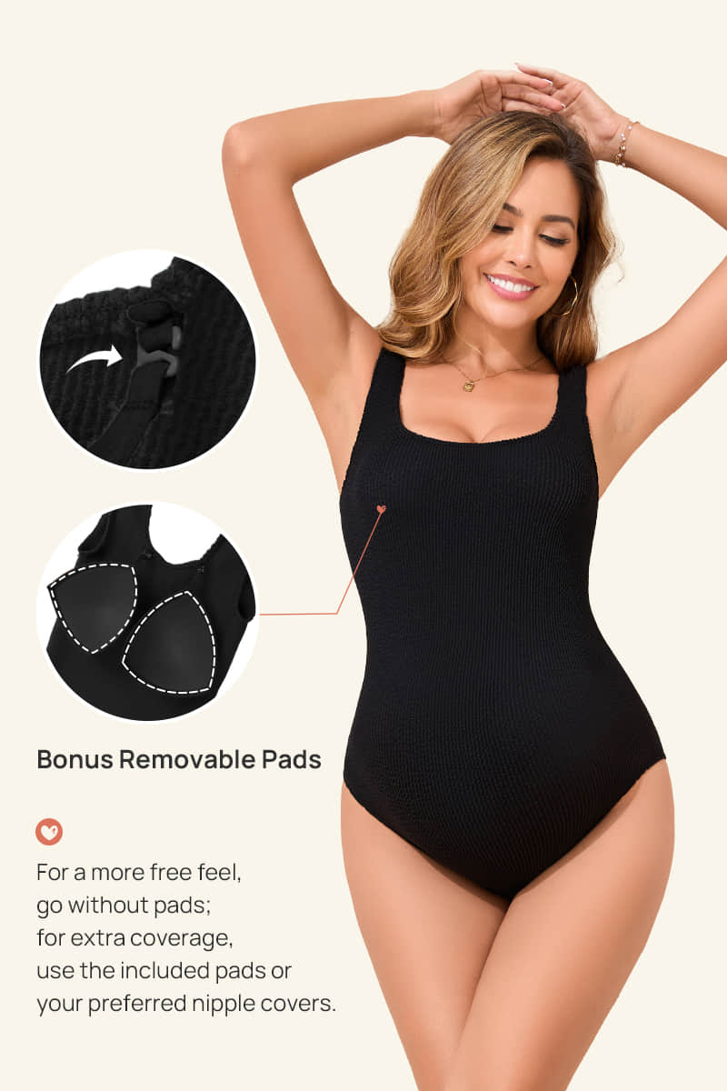 Elevate your maternity swimwear with this seamless one-piece swimsuit designed to adapt beautifully to your changing body. Crafted from premium, high-stretch ribbed fabric, this suit features a one-size-fits-most design that comfortably fits sizes S–XL throughout pregnancy. The classic one-piece silhouette is paired with a flattering U-shaped open back for a clean, modern look, while built-in support with removable padded cups allows you to customize coverage and shape as your body changes. The ultra-elastic fabric moves with you for all-day comfort and flexibility. Perfect for beach trips, poolside lounging, vacations, or family gatherings, this maternity swimsuit offers effortless style, comfort, and confidence for moms-to-be.