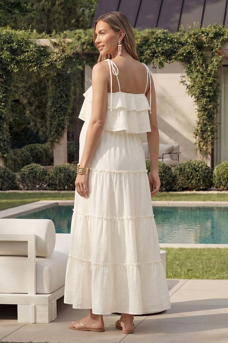 Design: Adjustable tie straps, double-layer ruffle bodice, empire waist, fully lined tiered maxi skirt.