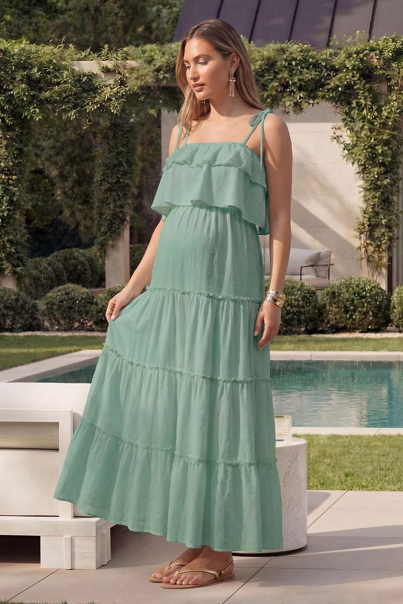 Radiate effortless Boho-chic elegance in the Summer Mae Tie-Strap Ruffled Maternity Maxi Dress. Featuring a romantic double-layer bodice and a breezy, tiered silhouette, this dress is designed to bring a touch of French-inspired charm to your spring and summer wardrobe.