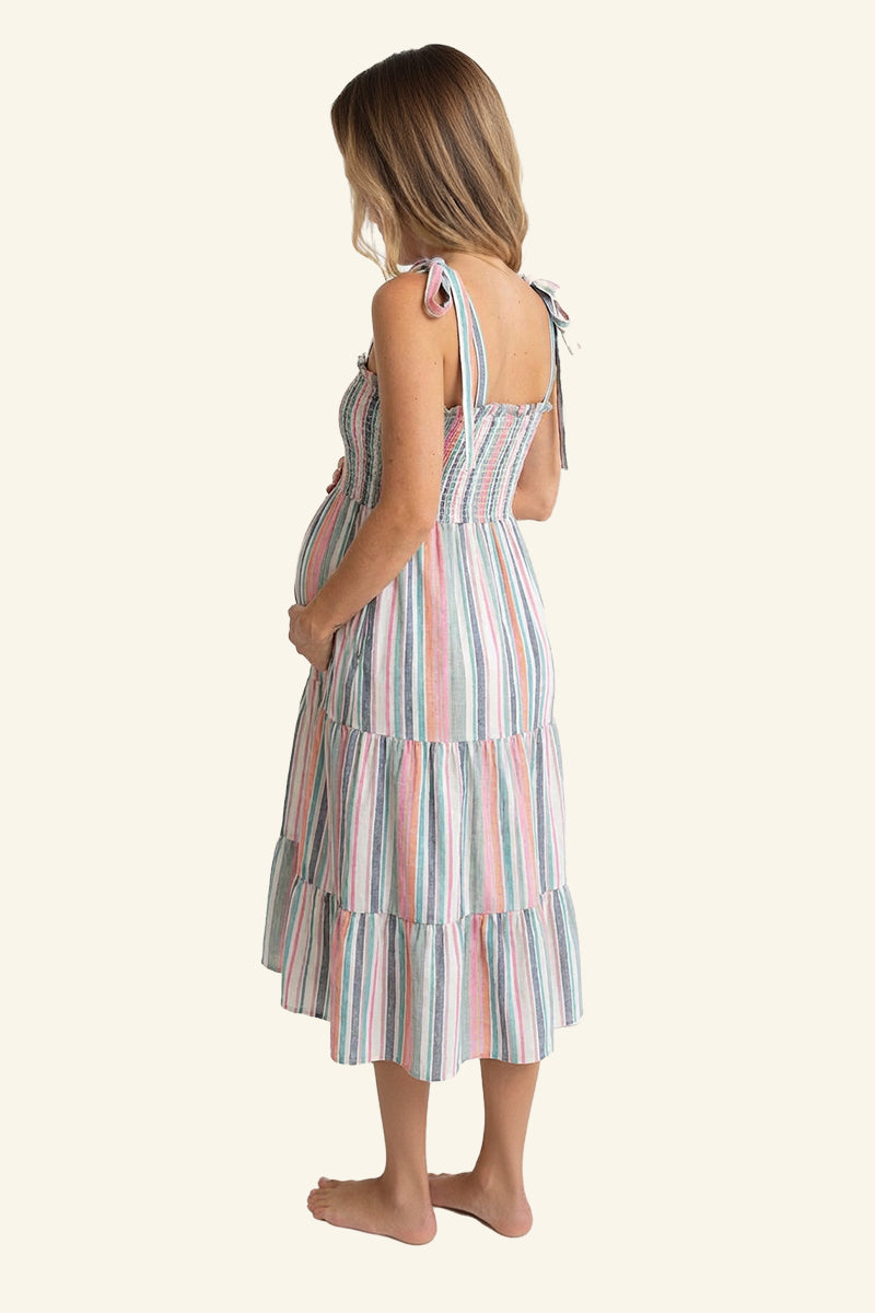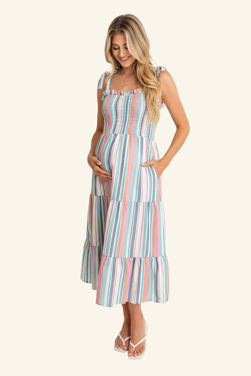 Made for sun-filled babymoon days and relaxed getaways, this maternity dress combines effortless comfort with a breezy, feminine feel. The smocked bodice and adjustable shoulder ties adapt beautifully to your changing shape, while the flowing tiered skirt creates an easy, flattering silhouette. Lightweight and breathable, this dress is perfect for beach walks, resort dinners, and capturing those unforgettable babymoon moments.
