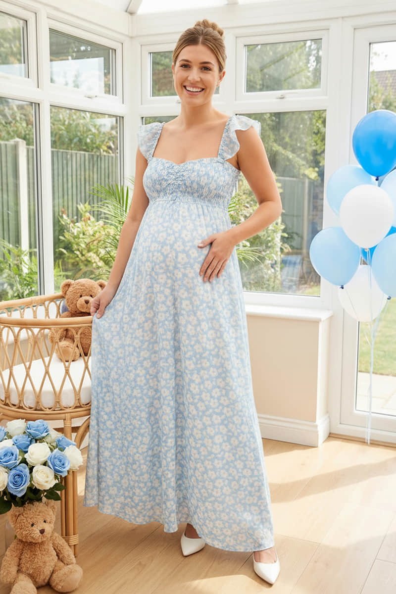 Perfect for baby showers and celebrating the joy of motherhood, this floral chiffon maternity maxi dress blends soft romance with all-day comfort. Designed with a flattering sweetheart neckline and off-shoulder sleeves, it creates a graceful, feminine silhouette that feels special without being overdone. The flowy maxi-length design drapes gently over your growing bump, offering a comfortable and flattering fit throughout pregnancy. Made from lightweight chiffon with a smooth lining, this dress is ideal for baby shower celebrations, maternity photos, or other special gatherings—helping you feel confident, comfortable, and beautifully dressed for every memorable moment.