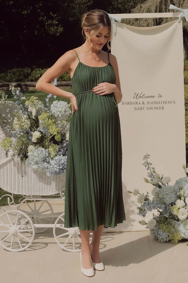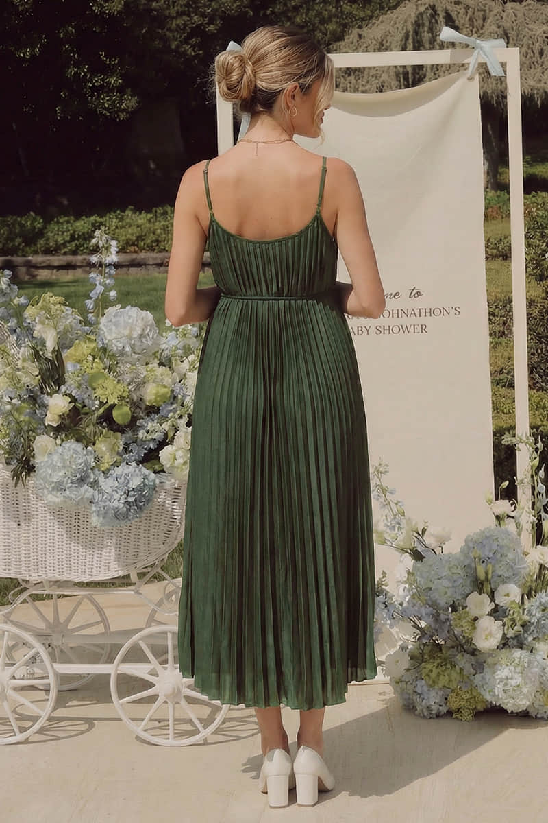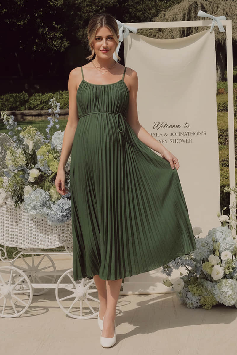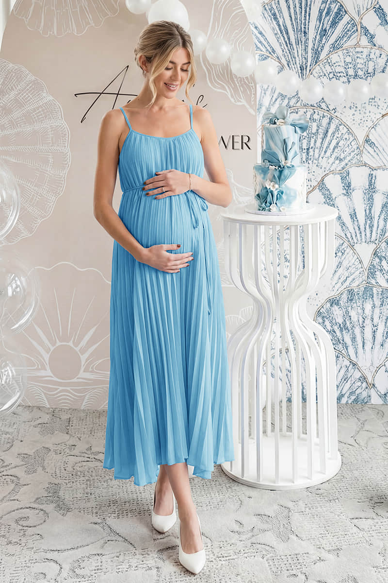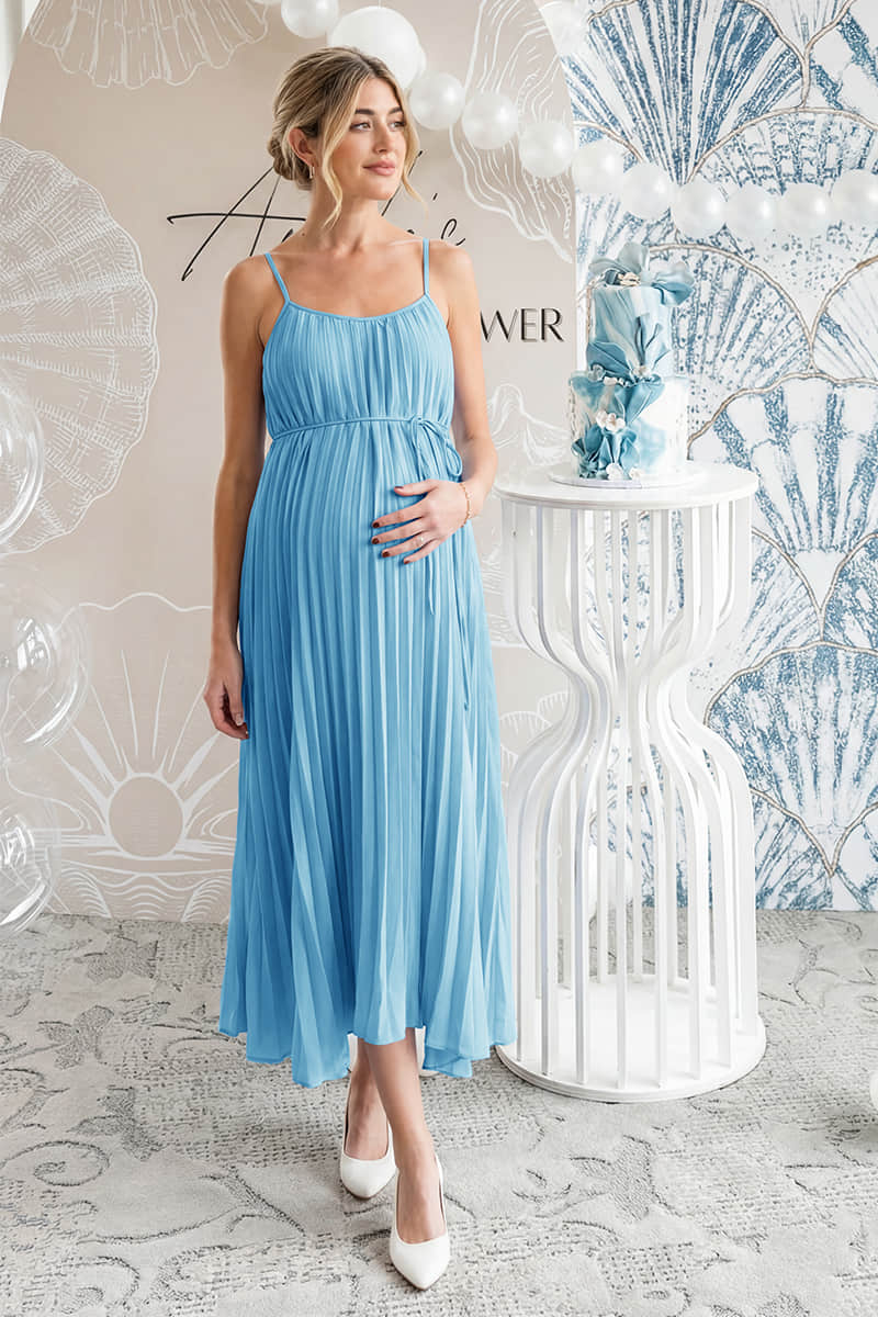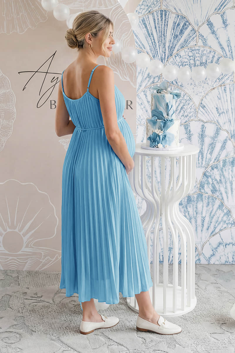 Gracefully designed to celebrate your pregnancy with effortless elegance, this pleated maternity midi dress combines soft texture with a flowing, feminine silhouette. Featuring allover pleated stripes, it creates subtle movement and visual depth while draping beautifully over your growing bump. The adjustable waist tie gently defines your shape, offering a flattering, customizable fit throughout every stage of pregnancy. Designed with sleeveless, adjustable shoulder straps and a refined midi length, this dress balances comfort and sophistication—making it perfect for baby showers, daytime gatherings, or elevated everyday wear. Lightweight and smooth to the touch, it’s a timeless piece that lets you feel relaxed, confident, and beautifully put together.