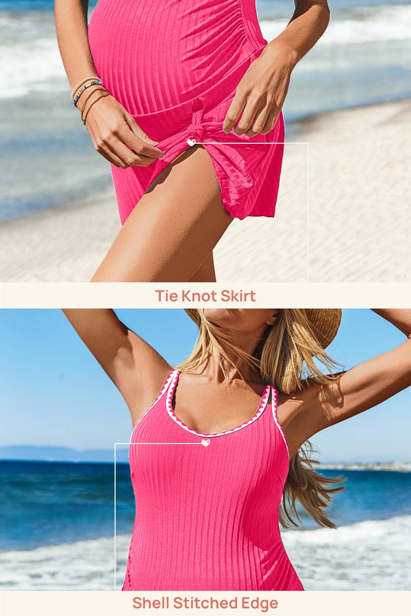 Elevate your pregnancy swimwear with our ribbed tie-knot maternity swim dress, featuring a chic tie-knot skirt for customizable length and coverage. The shell-stitched design and built-in triangle bottom, featuring high elastic ruching, offer a seamless silhouette and comfortable fit. With an adjustable double-strappy back and ribbed fabric, this suit supports and accentuates your curves.