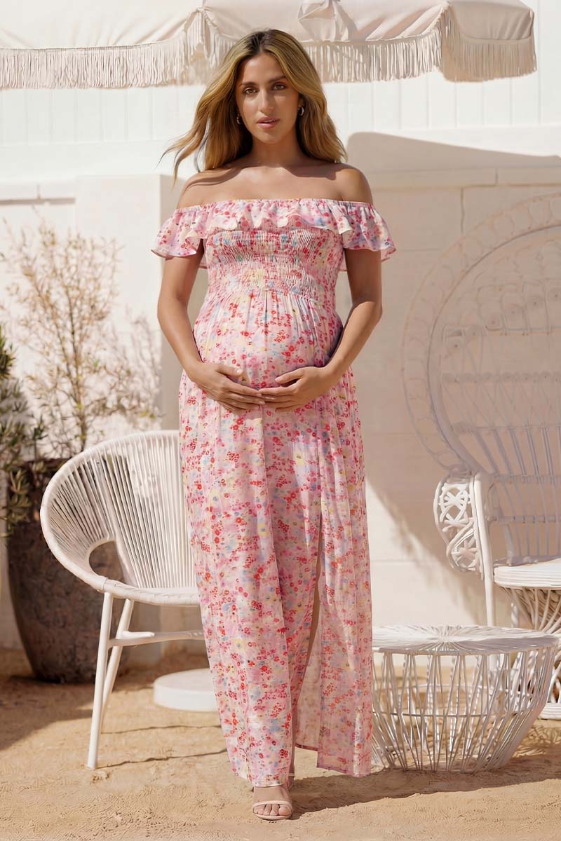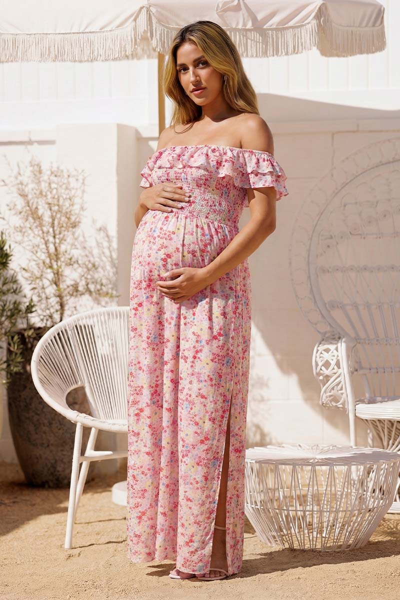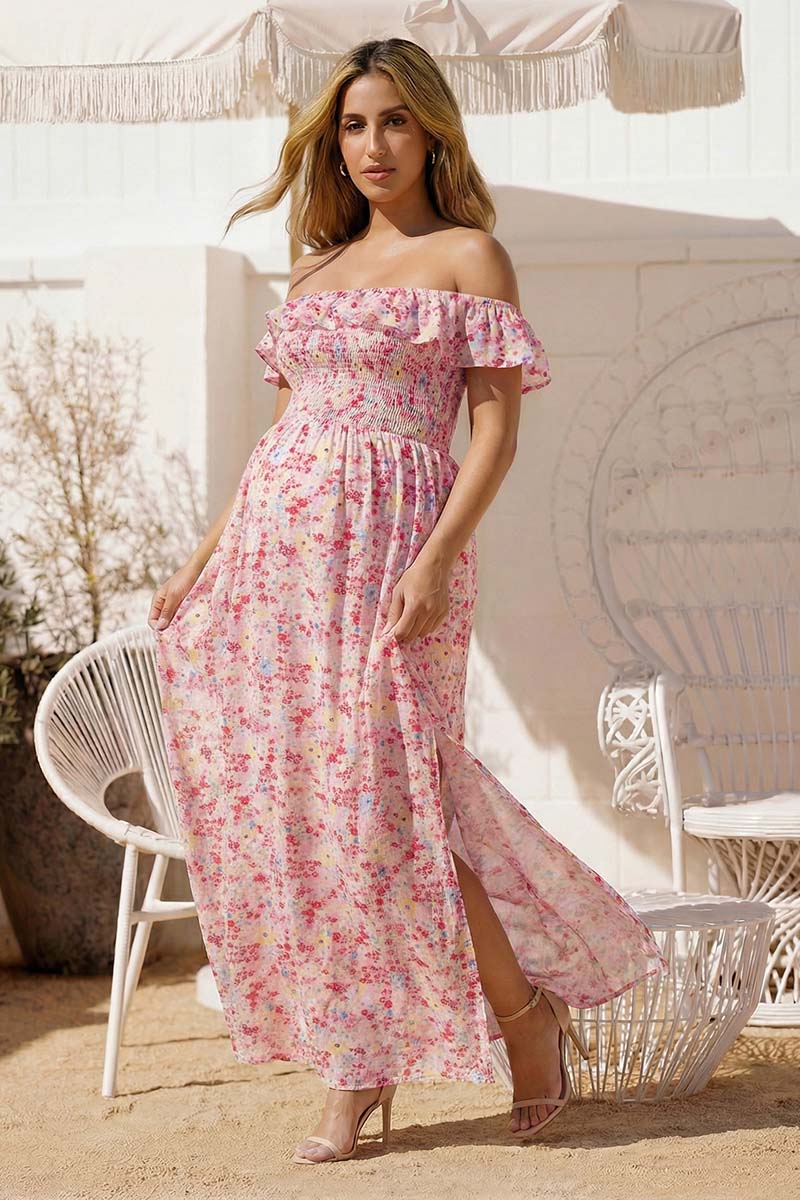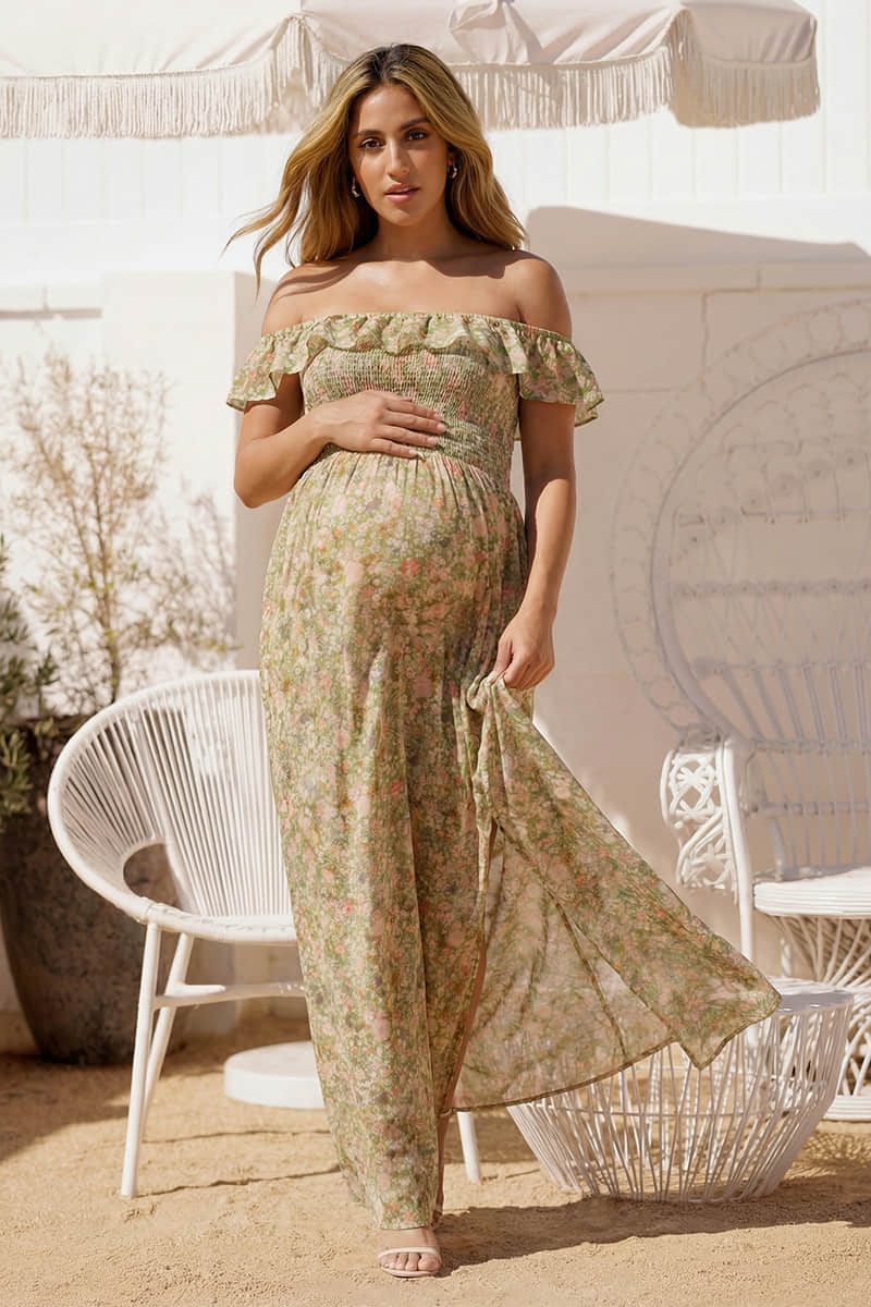 Romantic Ruffled Off Shoulder Pregnancy Dress with Slit | Bump Friendly Maxi