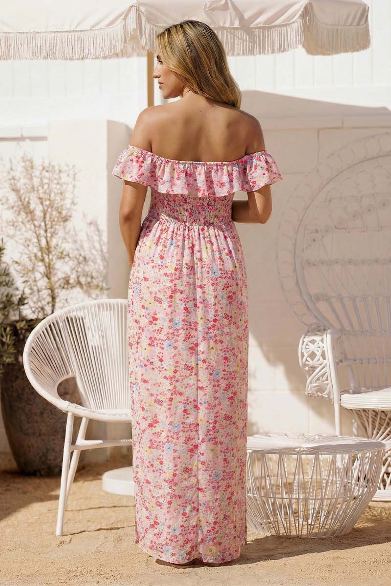 Design: Off-shoulder ruffle neckline, ultra-stretchy smocked bodice, maxi length with side slit.