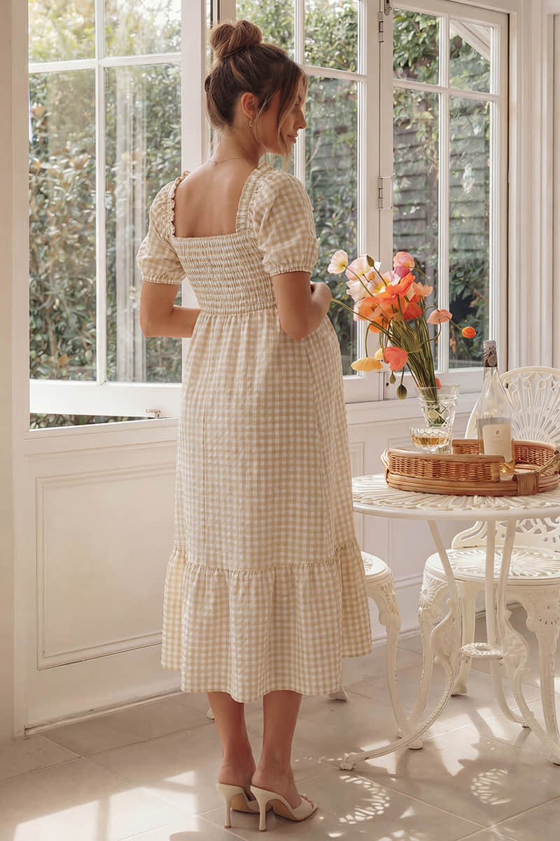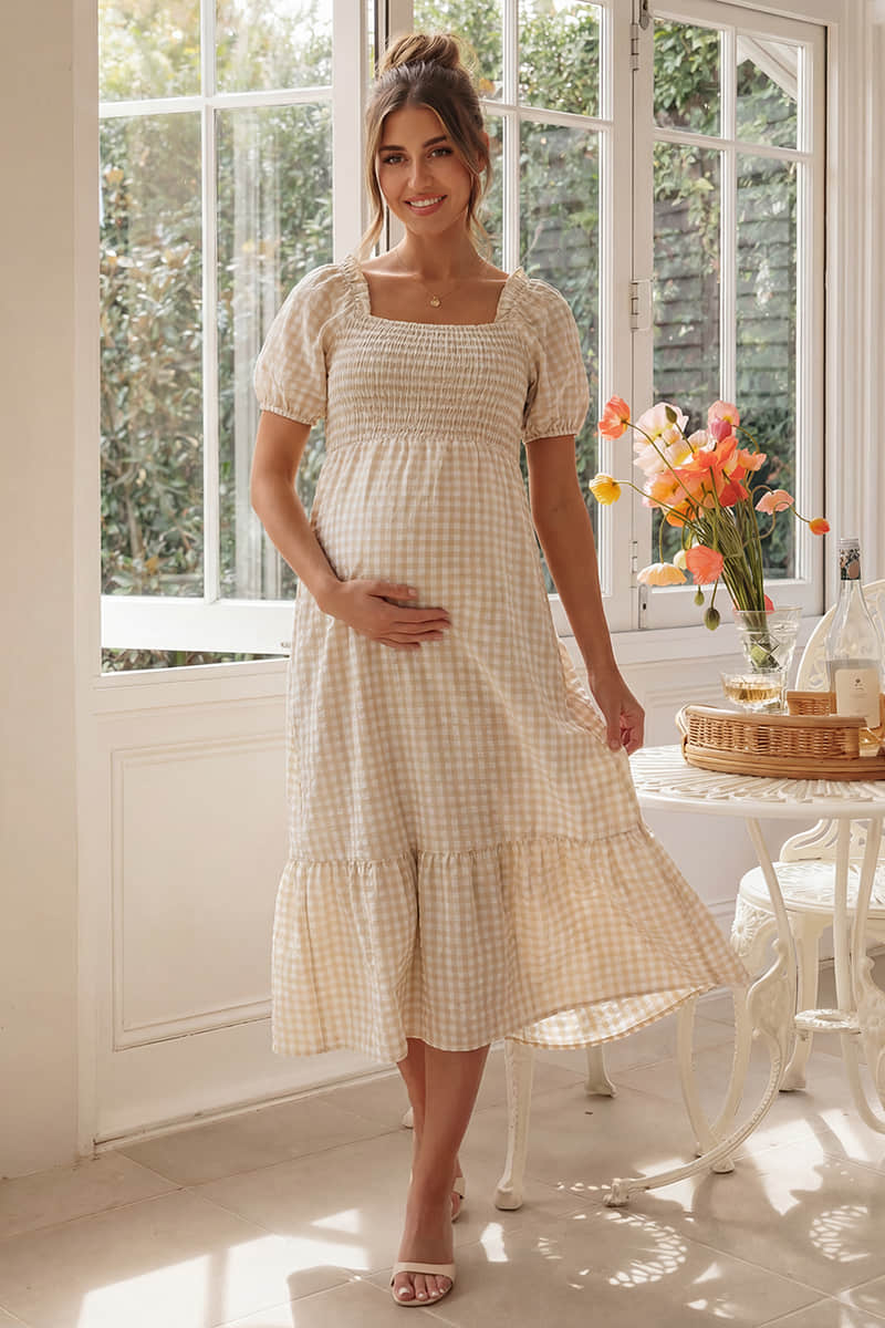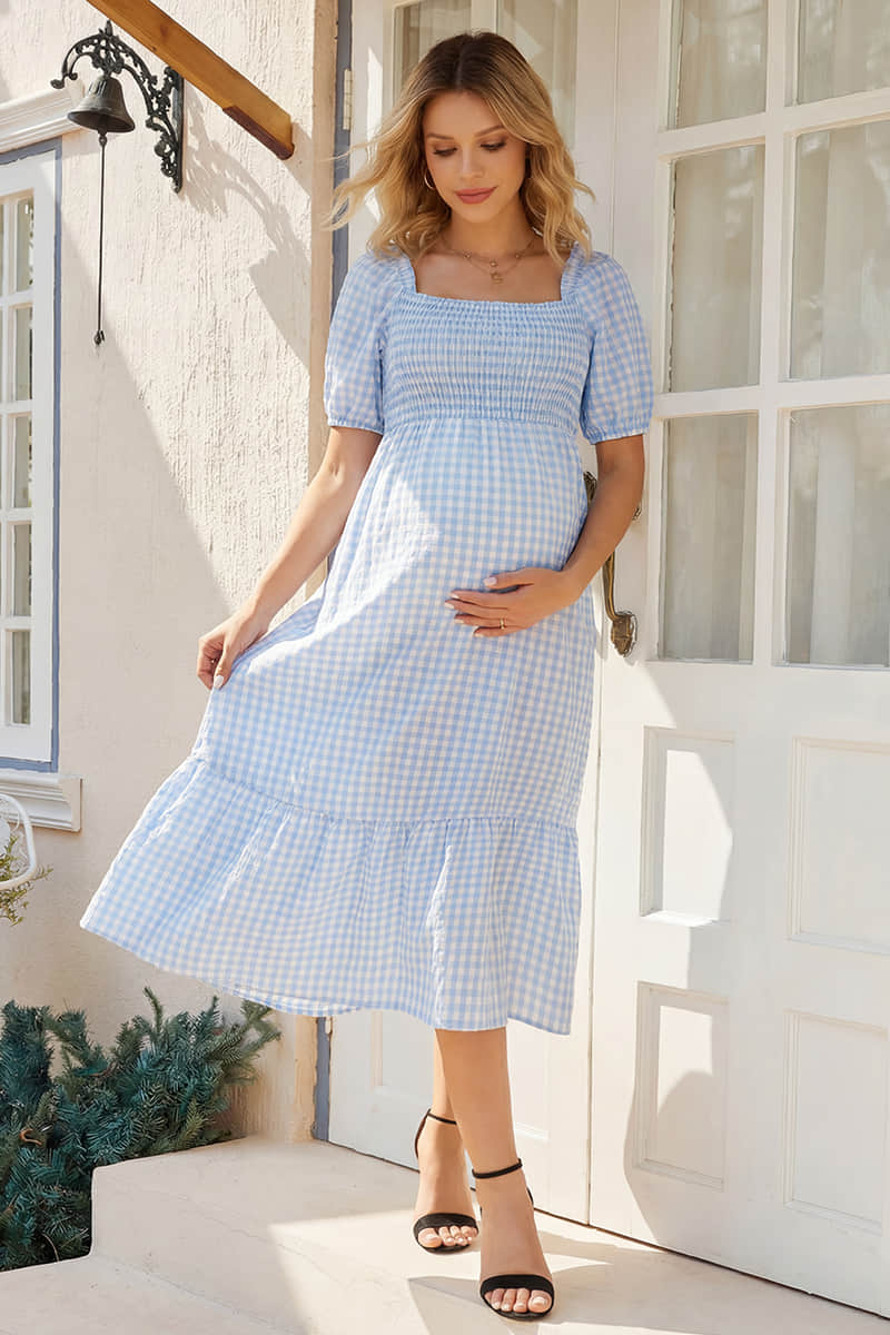 Smocked Plaid Puff Sleeve Maternity Midi Dress - Retro Gingham Empire Waist Vacation Gown