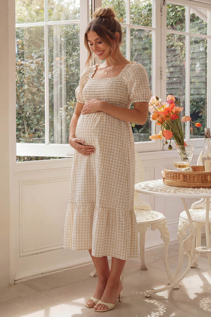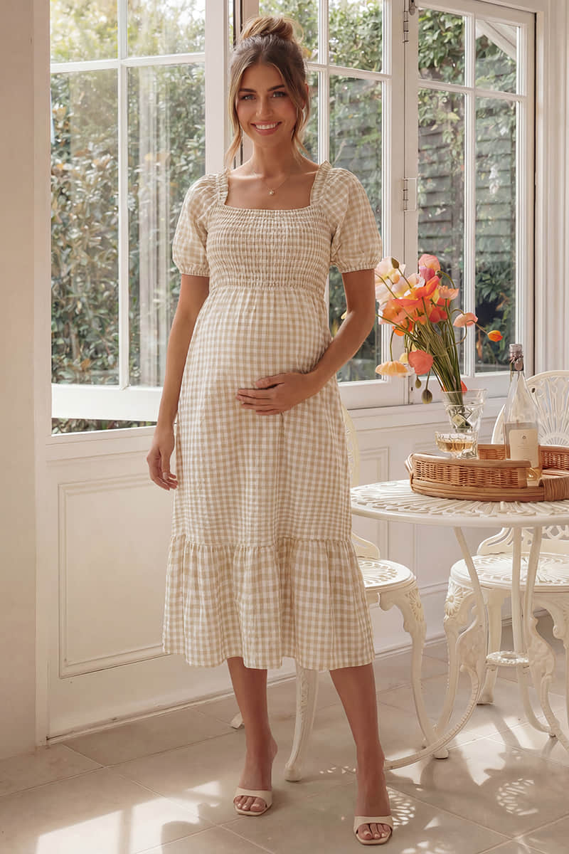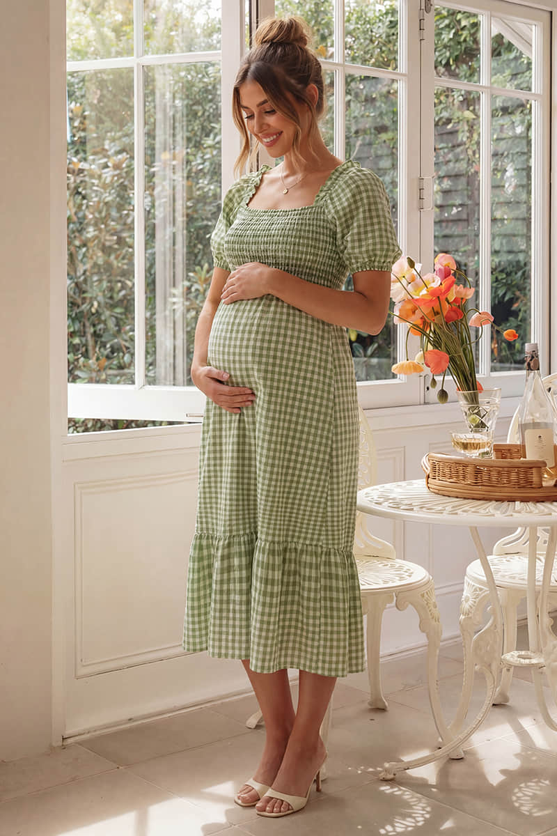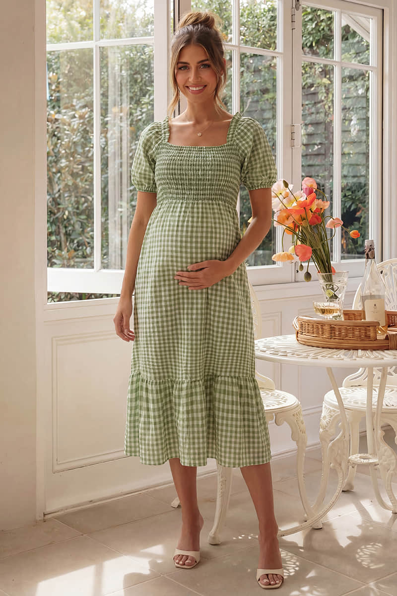 Classic Plaid Aesthetic: The sophisticated gingham print in earthy olive tones makes it a versatile staple for your maternity wardrobe.